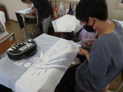 子どもたちは自分で好きなエプロンのデザインを選び,製作を楽しみにしていました。今日は形通りに布を裁ち,まち針をとめました。上手に作品ができるようにみんな丁寧に取り組んでいます。