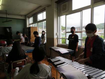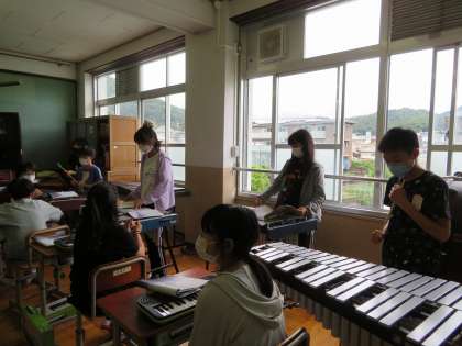 音楽では「星空はいつも」という曲で鉄琴と木琴の演奏をしました。子どもたちは久しぶりに楽器を演奏できてとても喜んでいました。パートに分かれて演奏することで,きれいなハーモニーと掛け合いがうまれます。周りの音を聴いては入れるように意識する姿が見られました。