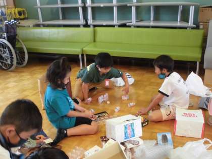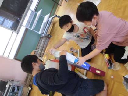 いよいよ集めた箱やプラスチック材が活躍しはじめるときとなりました。50人で集めるとどんなことができるようになるでしょうか。「うーん。もっと材料がいるなぁ」「もっと大きいヤツない?」「ゴム引っ張ったあと音なってる」など様々に話しながら,夢中になっていました。熱中すると時が「あっ」という間にすぎていきます。