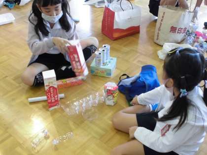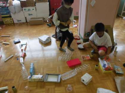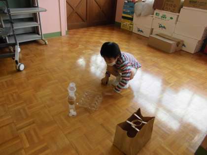 前回よりも集まった材料を集めて,「並べる」テーマに活動してみました。並べて行くと「ここ僕の部屋」「私が遊ぶ場所」と自分の家をイメージして並べていました。その隣では「おもしろボーリング」といって並べては壊して遊んでいました。次はどのような遊びを発明するでしょうか。楽しみです。
