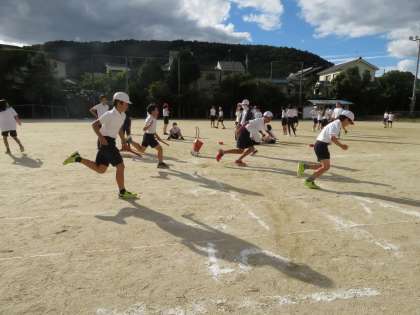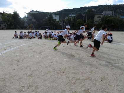 久しぶりにリレー練習をしました。バトンパス練習では合格,もう少しと声をかけ,より正確にバトンが相手に渡せるように確認をしました。回を重ねるごとに正確に渡ることも増え,だんだんと競った様子で応援している側も盛り上がりました。