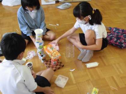 前回まで試したことを、ゲーム形式にして「おもちゃフェスティバル」と題し、クラス間交流をします。「どうしたらいいかな」「もっと、材料がいるなぁ」など相談する声が飛び交います。クラス間交流の12月には1年生を招く予定です。