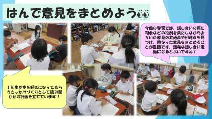 国語「はんで意見をまとめよう」の単元の学習では,1年生が本を好きになってもらえるような読み聞かせをするために,それぞれの異なった立場から意見を一つにまとめるという学習を行っています。