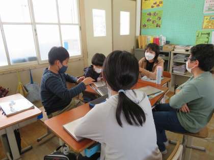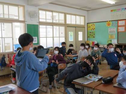外国語では“Who is he?Who is she?"クイズをしました。それぞれがアニメキャラクターや芸能人などから1人決め,その人物の性格や職業を紹介し,みんなにだれかを当ててもらうゲームです。みんなの知っている芸能人や本のキャラクター,偉人や学校の先生などいろいろな人物のクイズがあり,とても盛り上がりました!