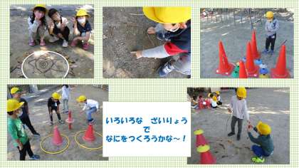 落ち葉や木の実,体育で使うマーカーやコーンなど幅広い材料の中から選んで形にしていきました。