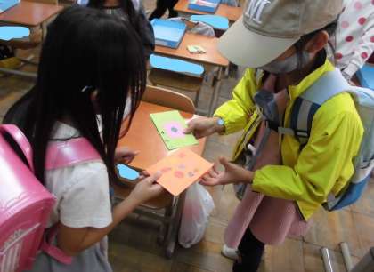 生活科での活動を広げて、クラス間で「おもちゃフェスティバル」の招待状を送り合いました。一対一での渡し合いの様子にほっこりします。「先生ぇ、何か照れくさいわぁ」と語ってくれました。機械の美しさもいいですが,手作りの気持ちがこもったものだと、出来栄えではなく、一生懸命な気持ちが伝わります。触れていなくとも、やさしいぬくもりが心に伝わったようでした。