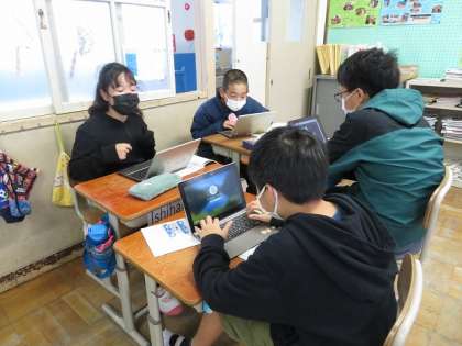 外国語では「ご当地あてクイズ」作りをしました。グループごとに都道府県の中から一つ場所を決めて,そこにあるものやそこでできること,食べられるもの,有名なものなどを英語で文にします。みんなどこにするか,何を紹介するかタブレットで調べながら盛り上がっていました。