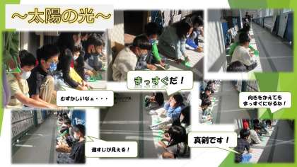 今回の太陽の光の実験も,いつもの実験場所がうまくかげができていないなぁと思っていたところ,3年生の教室の前にちょうど日光がさしていました!