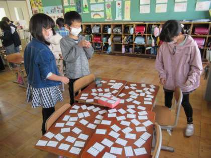 国語「短歌・俳句に親しもう」では、教科書に載っている短歌や俳句を声に出して楽しんだ後、百人一首を行いました。