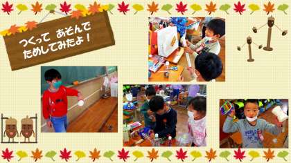 秋にみつけたものとお家から持ってきたものを使って,自分の思い思いのおもちゃを作ります。