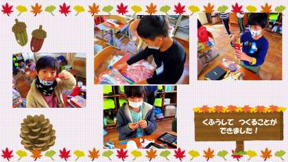 どんぐりや松ぼっくり,木の実に加えて,テープやビーズ,カラーペンなどを使って様々なものを作ることができましたね。
