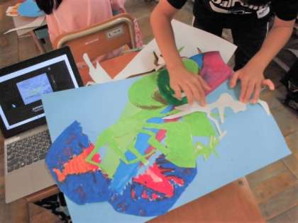 教室ではタマゴから色々なものが飛び出してきています。不思議なタマゴから、やっぱり不思議ないきものが生まれています。でも美しく、可愛らしいいきものたちを見て,誇らしげな小さなアーティストも生まれているようです。