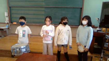 グループで皮を使った楽器でそろえたり、最後の音をそろえて演奏したりすることができました。