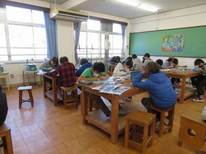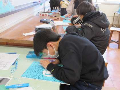 図工では版画をしています。友だちと肩を組んだり,笑顔でポーズをしたりしている様子を切出し刀を使って切り出し,小丸刀を使って彫っていました。目元や鼻など細かい所はゆっくり丁寧に行っています。こだわりをもって最後まで丁寧に仕上げてほしいと思います!