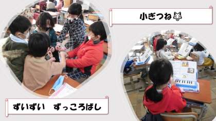 今日の音楽は、わらべうたや小ぎつねの鍵盤ハーモニカの学習を行いました。