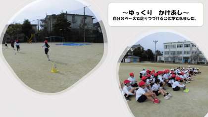 今日は、体育で「ゆっくり かけあし」の学習をしました。自分のペースで走りぬき、同じペースで走ることを意識して取り組むことができました。