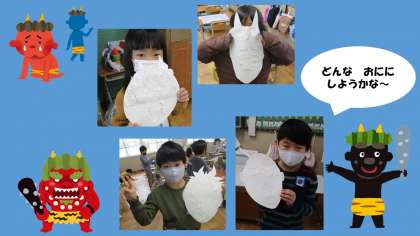 まずはどんな鬼がいるのかを知って,自分の描く鬼を決めて,顔の輪郭,髪の毛,耳,まゆ,目,鼻,口など順番に切って貼付けていきました。