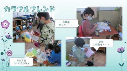 図画工作「カラフルフレンド」では,袋に布やタオル,花紙,フェルトなどをいれてカラフルなお友だちを作っています。