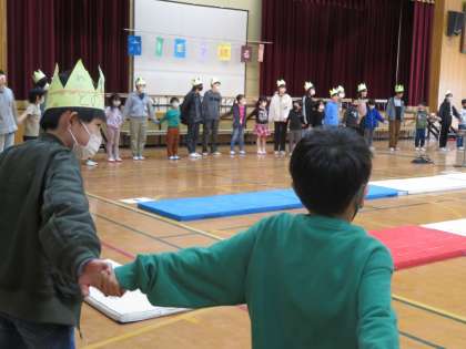 かがやきの1年生とペアになり,2年生の花道を通って入場しました。この1年かがやき活動でたくさんかかわってきた1年生は6年生に甘えたり,なついたりしてとても慕ってくれています。はじめは1年生が出し物をしてくれました。手をつないで歌をうたってくれました。2年生は素敵な言葉と歌を披露してくれました。これまでの6年間の思い出を大人になっても大切にしてほしいと思いました。