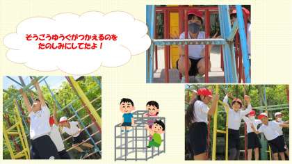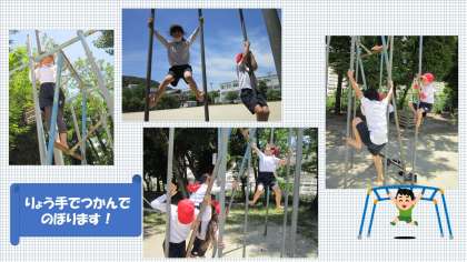 総合遊具にも慣れ,スイスイと移動して遊んだりぶら下がって遊んだり遊び方もそれぞれ。