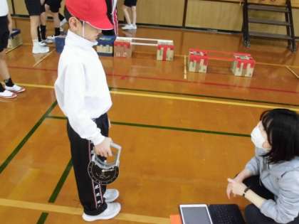 前回は長座体前屈といって,体の柔軟性を確かめる活動をしました。今回は握力もしました。「うわ」という声と共に,「思ったほか針いかへんかった」と残念そうな声も耳にしまた。この一年でどれほど変化があるか,これからの積重ねが楽しみです。