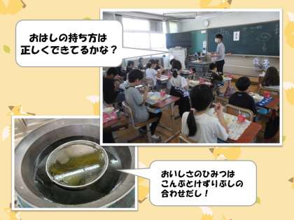 4年生では、「おはしは正しく持てているかな〜?」という担任の先生の問いかけに、「あ!忘れてた!」「これって正しいのかな?」とはしの持ち方を正そうとする子どもの姿が見られました。