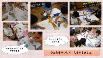 三角や丸、四角の形を鉛筆でうつし、その形からクレヨンで絵を描きました。