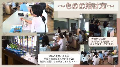今「ものの溶け方」「植物の発芽と成長」の2つの単元を同時に行っています。