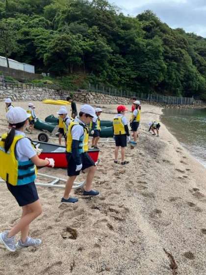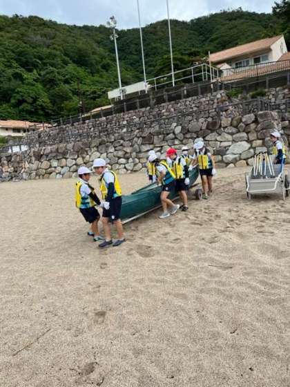 3人乗りカヌーを浜辺までみんなで運びます。オーエスオーエスの掛け声で、みんなで力を合わせて運びました。みんなで運べばあっという間!?に準備できました。