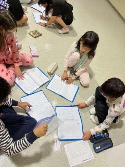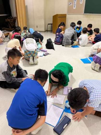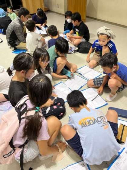 班ごとに今日の振り返りをしました。「シーカヤックで友達と協力できました。」「友達と前より仲良くなれたと思います。」「火の子の言葉を頑張りました。」一人ずつが今日の自分を振り返ることができました。