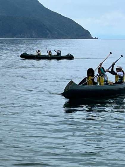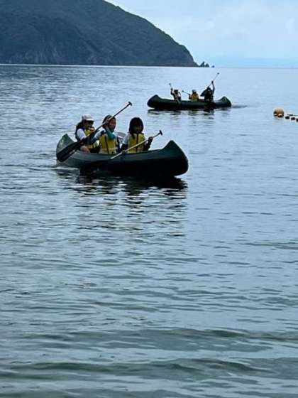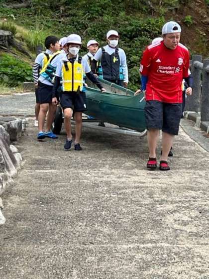 今日もみんなで力を合わせてカヌーを運びました。昨日さーカヤックを体験しているのでパドルの扱いも上手です。