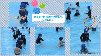 前回までの授業で確認したことを思い出しながら,顔つけや水中じゃんけんをして水の中で活動しました。
