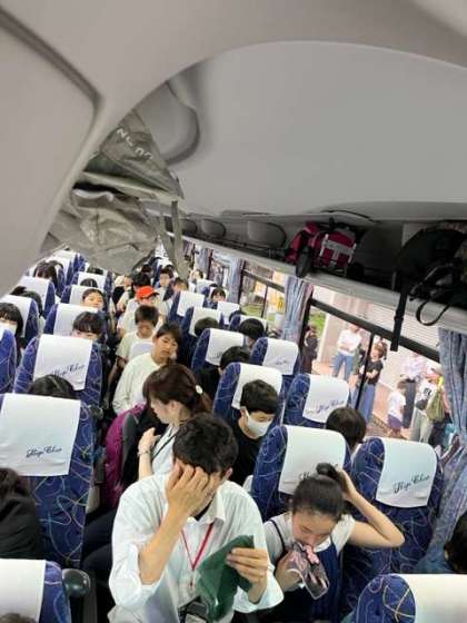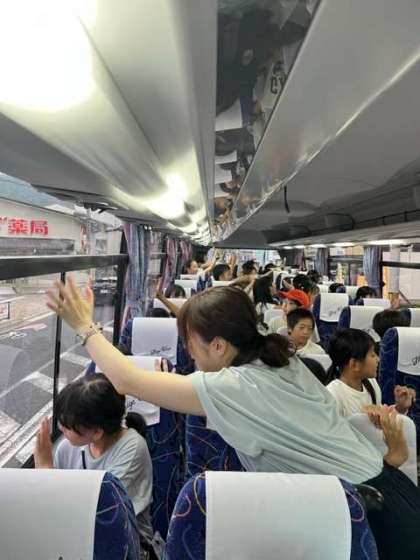 バスまでの道のりで汗だくになりましたが、バスの中は空調が効いていて快適です。ホッと一息ついて、いよいよ出発です。見送りの保護者の方々に手を振って、バスは動き出しました。行ってきまーす!