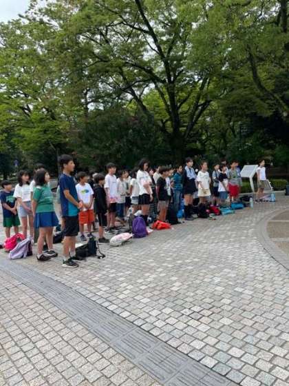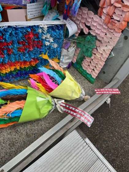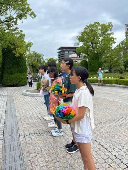 原爆の子の像にみんなで折った折り鶴を奉納しました。みんなの思いがつまった折り鶴です。