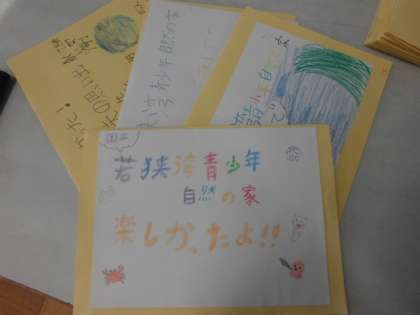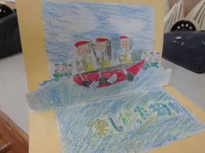 図画工作の仕掛けカードを利用して、思い出カードを作りました。カヤックやカヌーを中心した作品が多い中,やはり目立つのは「海」です。
