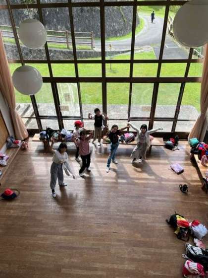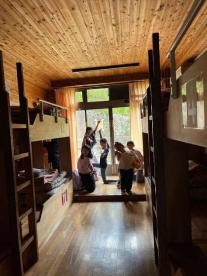 女子は6棟です。少し大きいつくりになっています。宿泊する部屋の中は2段ベットになっています。これから昼食に食堂へ向かいます。