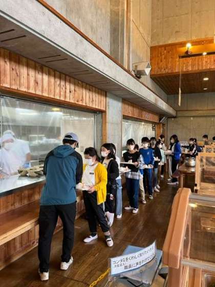 食堂での昼食タイムです。今日のメニューはきつねうどんとバイキング乳酸菌飲料です。
