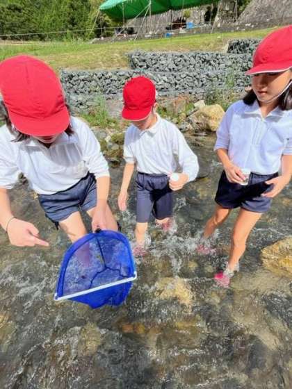 最後に捕まえた生き物たちを川に放して、さようならをしました。子どもたちの周りを赤とんぼが飛び交って、ちょっぴりですが秋の気配です。