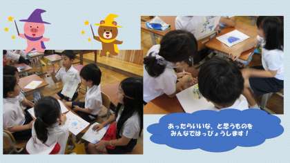 自分の思い描いたイメージをイラストにして,それがほしい理由やはたらき,形や色,大きさなどと一緒にグループで発表しました。