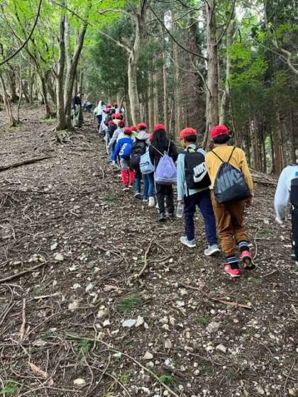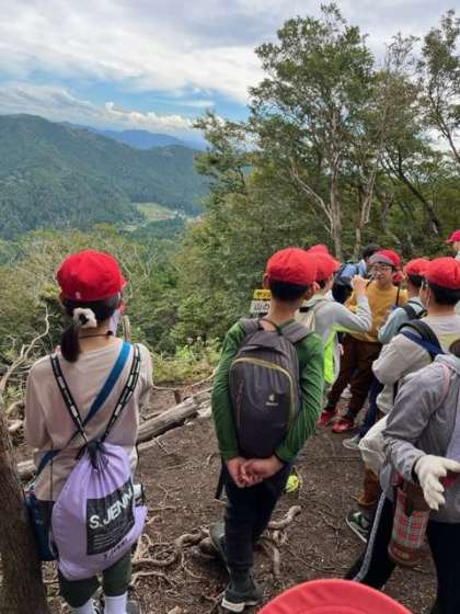 雲取山の頂上からの帰り道、ヤッホーポイントという場所がありました。そこからは山の家の建物がよく見えます。山の家に向かって、みんなでヤッホーと叫びました。すると、山の家の職員さんや大塚小学校のみんながヤッホーと返してくれました。無線の声と実際の声が届くまでに時間差があって、音速の学習になりました。