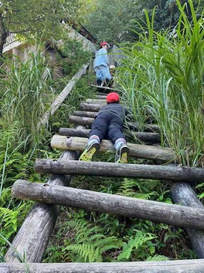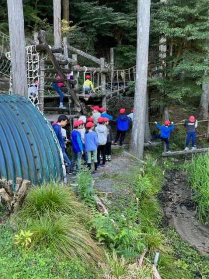 午前中の一つめの活動は冒険の森アスレチック体験です。鎖の網や丸太の階段を登っていきました。野猿など身体を思い切り使って楽しんでいました。