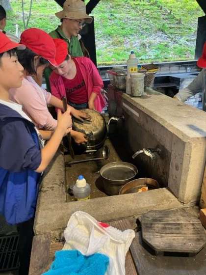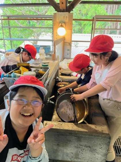 美味しく食べた後はみんなでお片付けです。山の家の自然環境を壊さないように所員の方にルールを聞いて、片付けを始めました。
