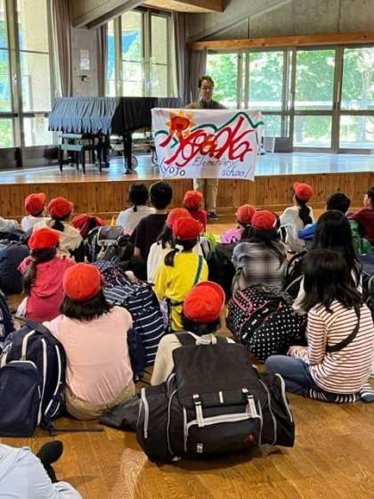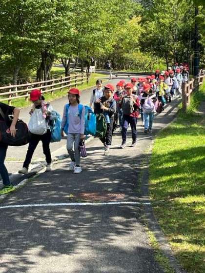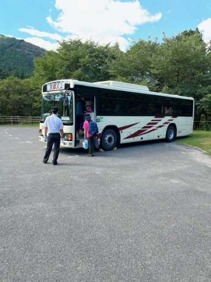 山の家の方々にお世話になったお礼をお伝えしました。怪我もなく最後まで元気に活動できましたね、と褒めていただきました。バスに乗車し、山の家を後にします。さようなら、山の家。