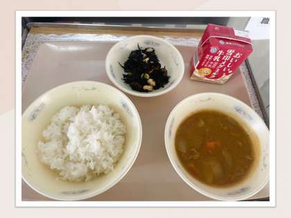 「ポークカレーのルーがおいしかったです。ひじきのまめがおいしかったです。ぜんぶおいしかったです。」(1年児童)