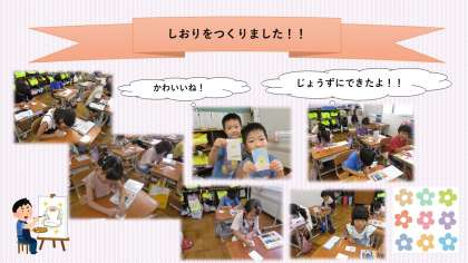 カラフルに色を塗ったり、好きなキャラクターを描いたりと、とても楽しいしおりができました。
