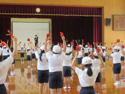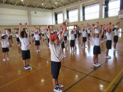 今日の体育は、3・4年生合同でスポーツデイの演技種目の練習をしました。振付けも覚えられたので、鳴子を持って踊りました。鳴子のいい音が体育館に響いていました。鳴子はタイミングよく降らないと音がそろいません。これから練習を重ねて、みんなでそろったいい音を出していけるようがんばります!