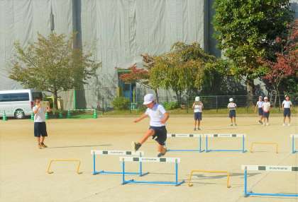 初めてのハードル走をしました。教室でアジア大会と世界陸上のハードル走を見て、イメージをもっての活動にしました。言葉では「またぐ感じで」と伝えますがスローで見ると跳んでるように見えます。