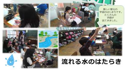 1時間目は教科書の写真を見て川の流れやその周りの様子について気づいたことを話しあいました。