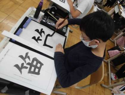 本日の書写は「笛」というです。正しい持ち方、始筆と終筆、右斜め上になどをはじめとして、座る位置、姿勢、机との距離など一つ一つを気を付けているとキリがありません。これらは既習として当たり前にと言いたいところですが、これがまた難しいです。