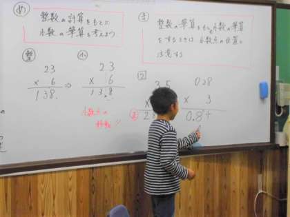 算数は少数の掛け算の内容を通して学習しています。少数の計算になっても、計算の進めま方は変わりはありません。ただ、基本道理にならって、位取りを行うことに注意を払います。